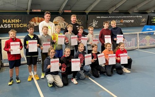 Tobias Prix (links) mit Dominik Hutterer (Nationaltrainer U12), Martin Kondert (Nationaltrainer U10) und den Teilnehmer:innen des U11 ÖTV-Einladungsturnieres.